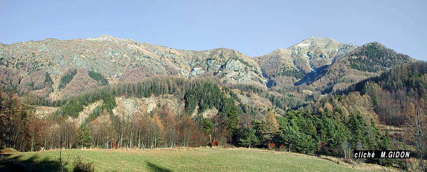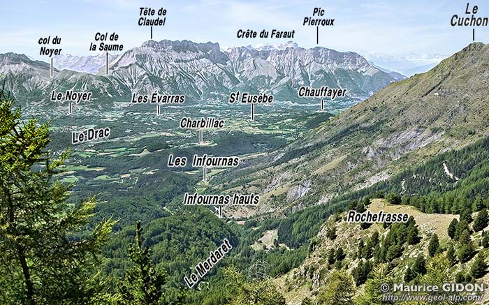 ![]() La rive droite du Champsaur au NE de Saint-Bonnet, vue des pentes du col Bayard. Extrait du Guide Rouge "Alpes du Dauphiné" (Masson, 1983) : dessin de J. DEBELMAS, d'après M.GIDON (retouché). |