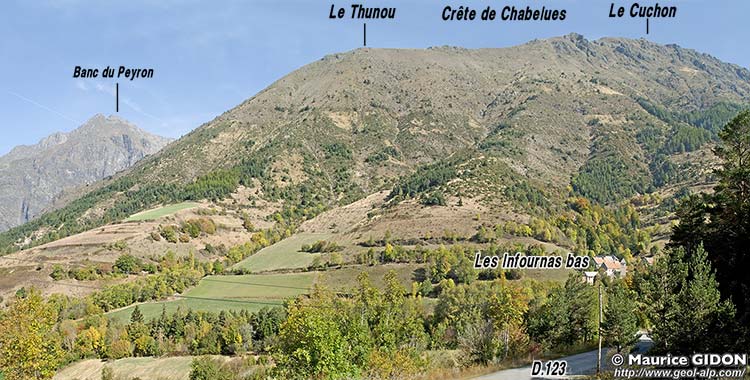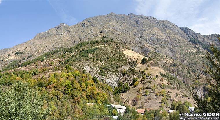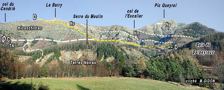 Il faut noter à ce propos que, plus au sud sur le versant oriental du Champsaur, notamment sous le Pic Queyrel ce chevauchement n'est plus visible, du fait qu'il y est cacheté, à partir du col de l'Escalier, par les couches très peu pentées du Nummulitique.