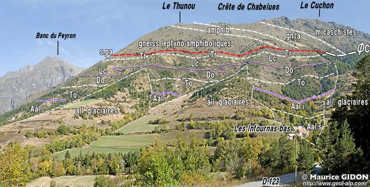 Cette disposition est celle que l'on observe au nord des Infournas, dans le versant sud-ouest du Thunou, où le Trias est assez épais et comporte plusieurs coulées de spilites* superposées. Elle poursuit simplement vers le sud celle du flanc occidental de l'anticlinal du Petit Chaillol, qui ploie la bordure du socle cristallin en la déversant par dessus le sillon subalpin (voir les pages "Chauffayer" et "Saint-Firmin").