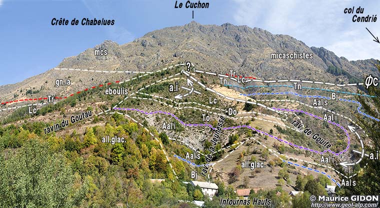 La cartographie des lieux suggère même que la surface de chevauchement, renversée, de l'anticlinal des Infournas n'est que le prolongement, dans la couverture sédimentaire, de celle du Chaillol, mais ceci au prix d'un raccord par torsion assez énigmatique, que les éboulis empèchent malheureusement de mieux analyser. Voir en outre les remarques complémentaires en fin de page **.