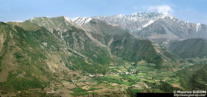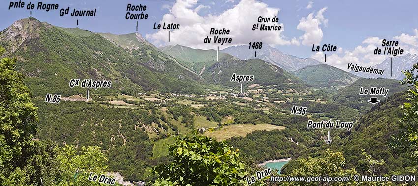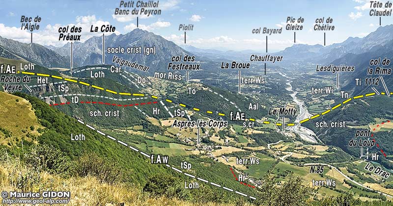 ![]() Vue d'ensemble du Champsaur d'aval vers l'amont (du nord), depuis les abords de la pointe de Rogne (chaînon du Laton). f.AW = faille occidentale d'Aspres ; f.AE (en jaune) = faille orientale d'Aspres ; tirets rouge : surface de la pénéplaine anté-triasique. mor.Riss = crête de moraine latérale abandonnée au Riss par le glacier de la Séveraysse (qui débouchait du Valgaudemar) ; terr.Ws = terrasse wurmienne supérieure (équivalent de la terrasse de Pellafol) ; terr.Wi = terrasse wurmienne inférieure. |