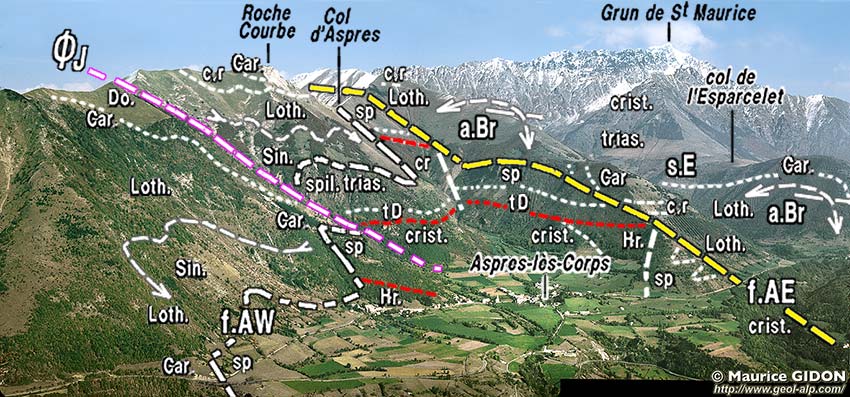 - La faille occidentale d'Aspres est un accident bien moins important. Elle est déversée vers le NW et remonte le socle cristallin, revêtu de dolomies et de spilites triasiques contre les bancs des divers niveaux du Lias, dont elle coupe obliquement les plis. Vers le haut, entre la Pointe de Rogne et celle de Roche Courbe, le Lias du compartiment situé au nord-ouest est même redoublé par un "chevauchement des Journaux" qui semble se brancher sur la faille occidentale d'Aspres et donc avoir été déterminé par la composante compressive de son jeu.