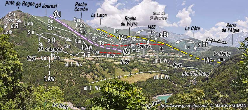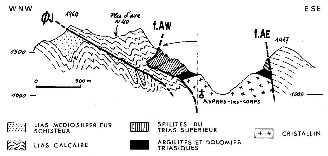 ![]() Coupe du chaînon du Laton sur la transversale de Roche Courbe et d'Aspres-lès-Corps, extrait de la publication n° 70, retouché. ØJ = chevauchement des Journaux : noter qu'il recoupe les plis qui affectent sa lèvre inférieure (qui sont donc sans doute de formation antérieure) ; f.AW = faille occidentale d'Aspres ; f.AE = faille orientale d'Aspres . |