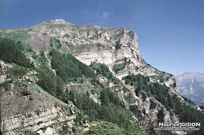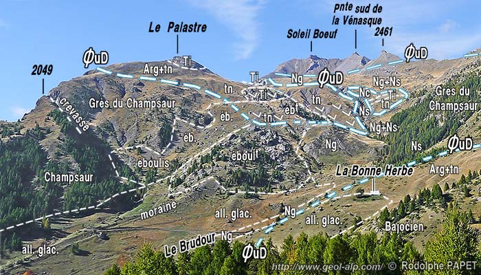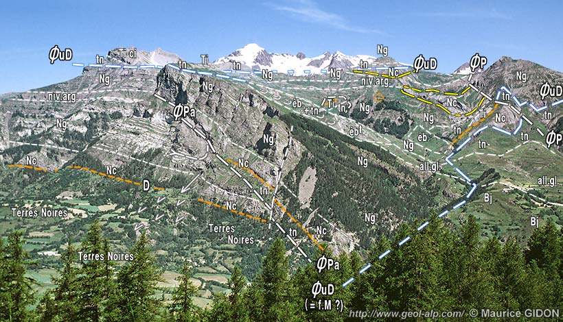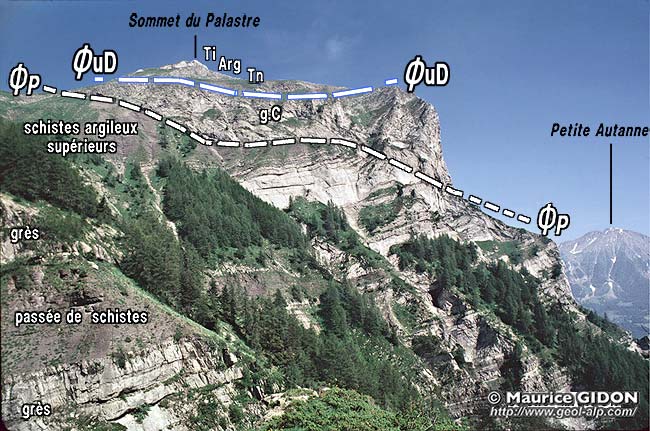 ![]() Le versant occidental du Palastre vu du sud, depuis les pentes dominant Pont-du-Fossé, entre Saint-Léger-les-Mélèzes et la Petite Autane. ØuD = chevauchement de l'écaille ultradauphinoise de Soleil-Boeuf ; ØPa = chevauchement du Palastre (noter la charnière en crochon* synclinal dans le compartiment chevauché, à l'aplomb du sommet) ; ØP = chevauchement de la Pousterle (voir la page "Pousterle") ; D = surface de transgression discordante du Nummulitique (en orange) ; niv.arg. = niveau de schistes argileux supérieurs dans les grès du Champsaur nummulitiques. |
