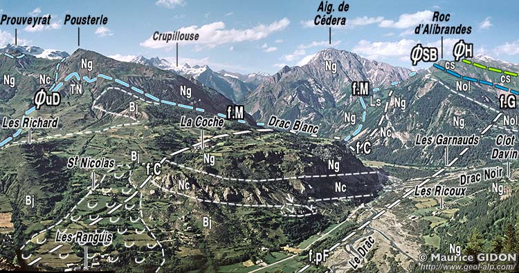 ![]() Le versant nord de la Petite Autane, vu de Saint-Jean, en rive droite du Drac. f.pF = faille de Pont-du-Fossé (partagée, à gauche, en deux branches parallèles : "a" et "b") ; f.G = faille du Gariveau ; ØE = surface de base des nappes de l'Embrunais ; sBi = unité subbriançonnaise basale (flysch noir emballant des lames de calcschistes du Crétacé supérieur) ; u.Pi = unité de Piolit (Terres Noires à Crétacé supérieur : voir la page "Piolit") ; n.P = nappe du Parpaillon. |
