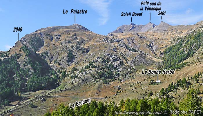 Ce petit sommet a la structure d'un crêt* à regard ouest, dont les abrupts offrent une coupe naturelle de la succession nummulitique : elle montre bien la disposition des gros bancs de grès que séparent des vires argileuses plus ou moins importantes selon le niveau (voir le cliché à la page "roches sédimentaires"). Elle montre aussi avec une grande évidence la présence d'un chevauchement, par faille inverse avec crochon*, dont la surface de cassure recoupe la crête peu au nord du sommet. Ce chevauchement du Palastre appartient à la même famille de déformations que les chevauchements du Queyrel et de Barbeyroux qui affectent de la même façon les couches nummulitiques plus au nord-ouest (voir aussi la page "Queyrel").