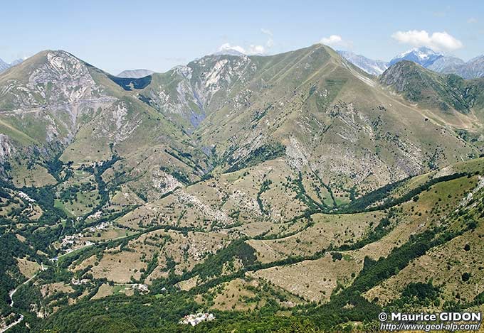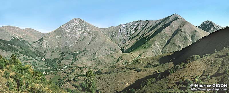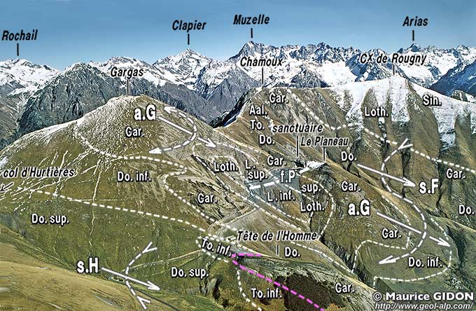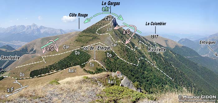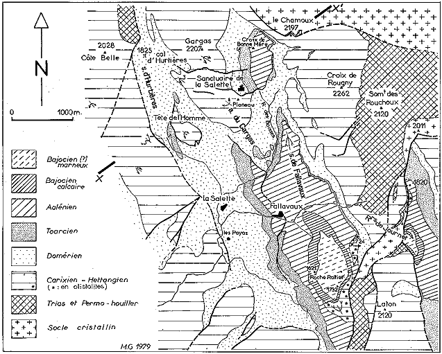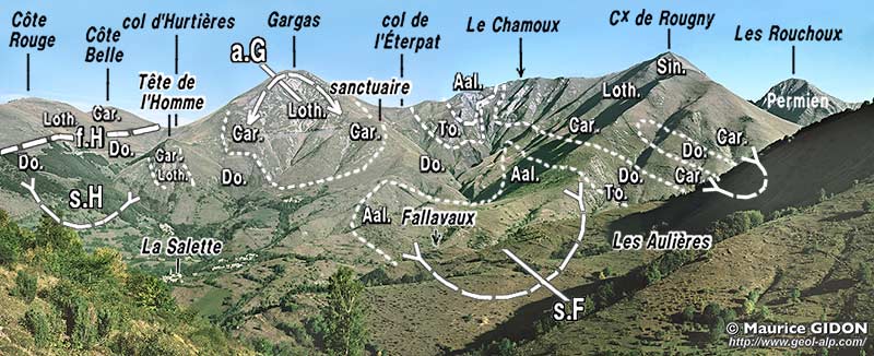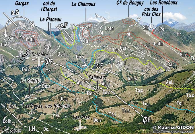 ![]() La dépression de Fallavaux et ses pentes nord-orientales : détails structuraux vus du sud, depuis le Grand Journal. a.G = anticlinal du Gargas ; s.F = synclinal de Fallavaux ; ØF = chevauchement de Fallavaux. c.r. = couches à patine rouille du Lotharingien supérieur. Alors que du côté ouest, aux abords des villages de Fallavaux, les couches marneuses du Domérien et du Toarcien se développent sur une épaisseur de plusieurs centaines de mètres, par contre elles se réduisent à quelques dizaines de mètres seulement du côté est, sur les pentes de la Croix de Rougny et du Chamoux (amincissement par onlap sur une paléopente : cf. ci-dessus). L'anticlinal du Gargas s'amortit vers le sud au sein du cœur du synclinal de Fallavaux mais cela semble être à l'origine du petit chevauchement de Fallavaux qui redouble la barre de l'Aalénien inférieur au niveau de ce village et la barre du Toarcien inférieur plus au sud. La crête qui va du Chamoux à la Croix de Rougny est le siège de multiples replis mineurs qui semblent se déverser de plus en plus vers l'ouest lorsque l'on s'élève dans le versant (on ne les a représenté que schématiquement). (le revers nord-oriental de cette crête est représenté à la page "Bas Valjouffrey") |