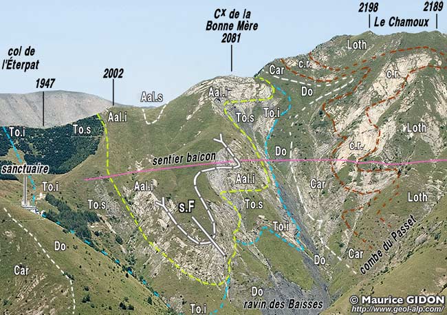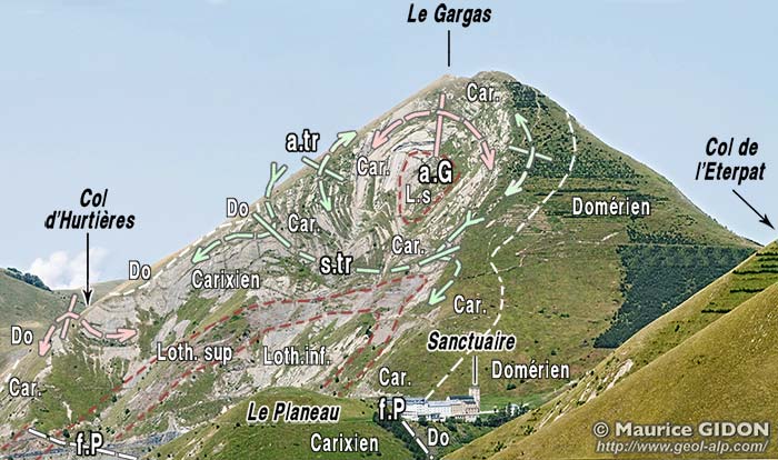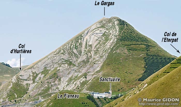 En contrebas de la route la boutonnière se referme car le pendage des couches de la voûte du pli devient plus forte que la pente topographique : la coupe du ravin de la Sézia, qui est presque parallèle à l'axe de l'anticlinal, met en évidence cette ondulation anticlinale transverse, presque E-W, qui affecte la charnière du pli (voir ci-dessus le cliché d'ensemble du site du sanctuaire).