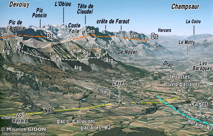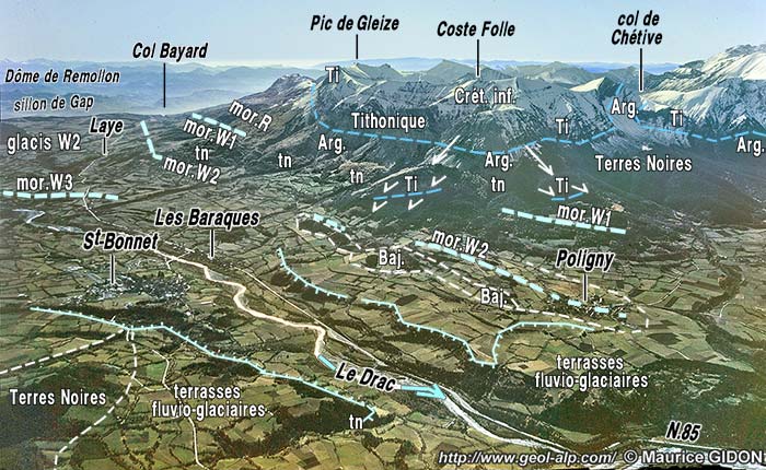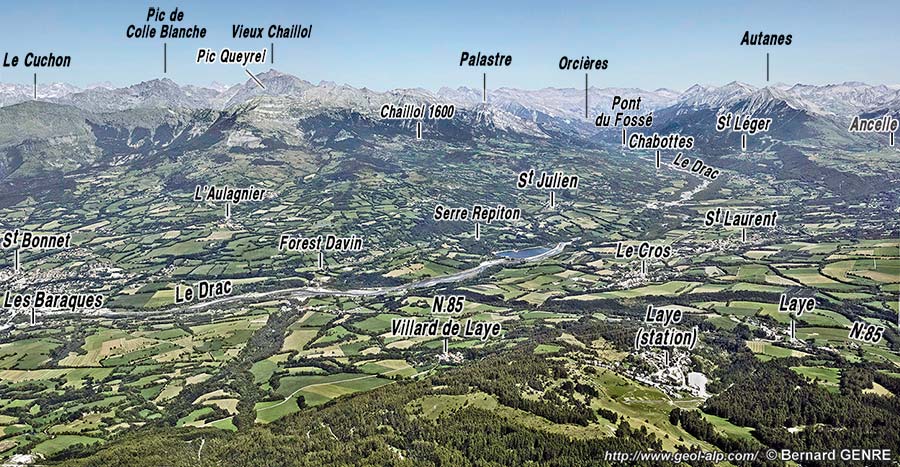 Dans leur ensemble ces pentes forment un bombement convexe, saillant vers le SW, dû au fait que le cours du Drac s'incurve vers l'est, au sud de Saint-Bonnet, en s'éloignant des escarpements du rebord subalpin pour se diriger vers l'est en direction des pentes de bordure des massifs du Pelvoux et de l'Embrunais, dont il s'échappe (voir la page "Chabottes").