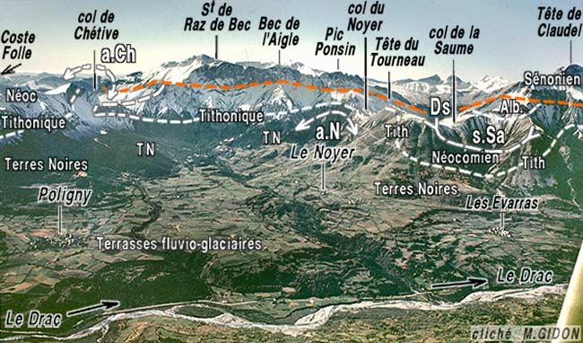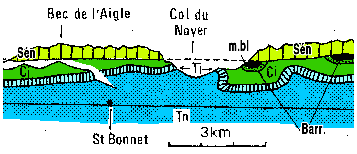 En rive gauche toujours le fond, moins déclive, de la vallée s'élargit en aval de Saint-Bonnet à partir de Poligny et surtout au niveau du Noyer. Ce diverticule, orthogonal au cours du Drac, correspond à une combe anticlinale*. En effet l'érosion y a affouillé, jusqu'à son coeur de Terres Noires, un anticlinal du Noyer, anté-Sénonien, dont l'axe, orienté est-ouest, est légèrement déversé vers le nord (pour plus de détails voir la page "Le Noyer").