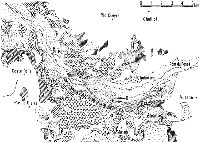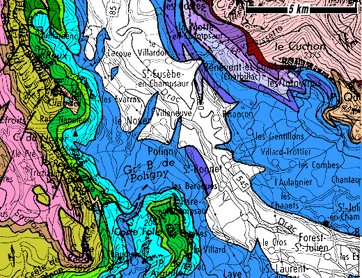 L'extension en superficie des affleurements de Terres Noires est sans doute essentiellement due à leur épaisseur ; mais il se peut aussi qu'il soit accru par un redoublement tectonique, car on voit pointer en rive gauche des affleurements de Bajocien dans le soubassement de la moraine de Poligny (voir le cliché ci-dessus), loin des affleurements de rive droite (Les Infournas). Il est plausible que l'on observe là le prolongement méridional du repli anticlinal des Costes qui se manifeste à l'ouest de la Motte-en-Champsaur par une bande d'affleurements bajociens qui se prolonge preque jusqu' à la latitude de Pisançon (voir la carte schématique en fin de page). |