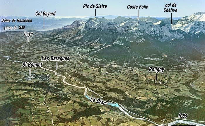 En rive gauche le versant se redresse assez rapidement, sous la corniche calcaire du Tithonique qui arme le crêt* de Coste Folle. Au sud de Saint-Bonnet la pente du fond de vallée s'élargit et s'élève plus doucement, par des ressauts qui correspondent aux terrasses et aux bourrelets morainiques résiduels, entre Laye et Saint-Laurent du Cros. Elles se raccordent là au versant septentrional de la très large trouée du col Bayard, qui fait communiquer le Champsaur avec le sillon de Gap, en séparant le Dévoluy des montagne de l'Embrunais occidental (voir les pages "col Bayard" et "Chabottes").