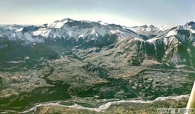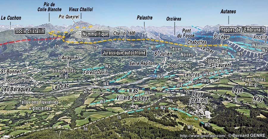 À la latitude de Saint-Bonnet les deux versants du Champsaur s'élèvent d'abord en pente douce car ils ont pour soubassement les Terres Noires qui ont été mises à nu tout le long de la vallée du Drac : en effet celle-ci suit là le pied du "rebord subalpin*, en bordure du massif du Dévoluy. Cette particularité confère à la vallée une nette dissymétrie de ses flancs, qui correspond au fait qu'il s'agit donc là d'une typique "combe monoclinale"*, plus raide du côté ouest qui correspond au pied de la corniche tithonique. Mais les couches marneuses du fond de vallée sont le plus souvent cachées par des alluvions glaciaires et fluvio-glaciaires dont les placages étagés rompent par des ressauts la régularité de la pente des versants.
