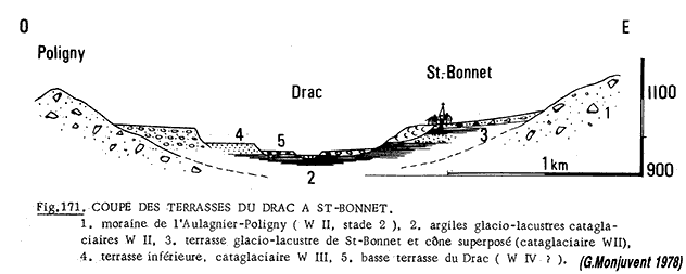 Le fond de vallée est en effet colmaté par des alluvions fluviatiles entaillées en terrasses emboîtées ; les plus élevées (donc les plus anciennes) s'appuient sur les dépôts morainiques qui garnissent la partie supérieure des basses pentes des deux versants (L'Aulagnier à l'est, La Fare et Poligny à l'ouest).