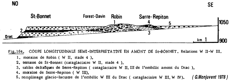 Cette trouée a été ouverte par une érosion ancienne, sans doute fluviatile, mais elle a été parcourue et modelée par la langue "diffluente"* provenant du glacier de la Durance : cette dernière passait, au maximum de Würm et jusqu'à la fin du stade de retrait n°2, par dessus toute la largeur du seuil presque plat qui s'étend entre le col Bayard et celui de Manse (voir son versant méridional à la page "col Bayard"). Les alluvions déposées par le glacier du Drac ne reprennent sur le versant de Saint-Bonnet qu'assez bas dans la pente : elles correspondent à celles du stade 3 du retrait de Würm, représentées par la moraine du Cros.
