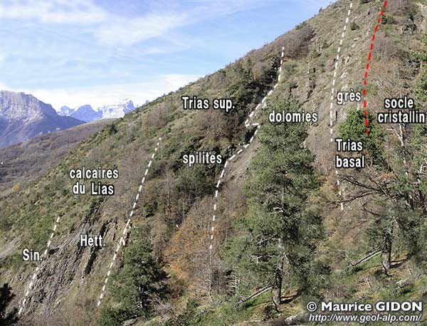 ![]() Les pentes de rive droite (nord-ouest) du ravin du Villard, vues du sud, vers l'altitude de 1600 m, depuis le chemin qui monte depuis l'Esparcelet vers le Bec de l'Aigle. Ce cliché montre que l'interface socle - couverture (en rouge) ne pend encore que très fortement vers l'ouest à ce niveau du versant (on trouvera une analyse détaillée de la succession des couches qu'elle supporte dans l'opuscule de G. BUFFET, 1989). |