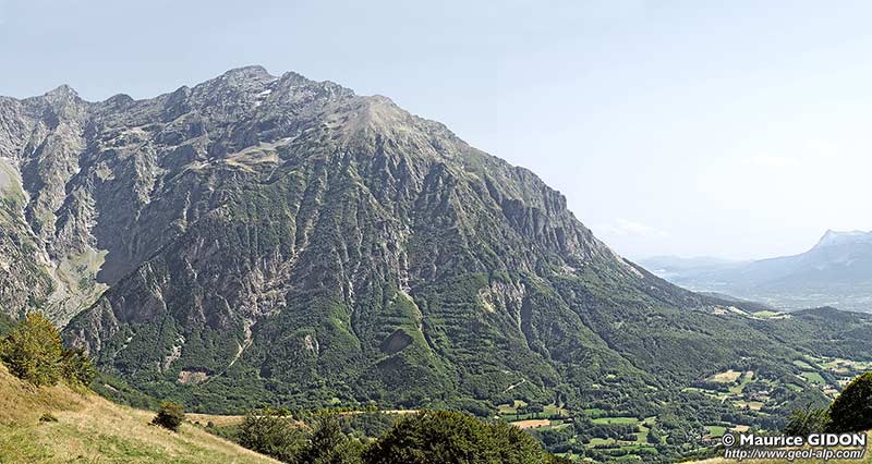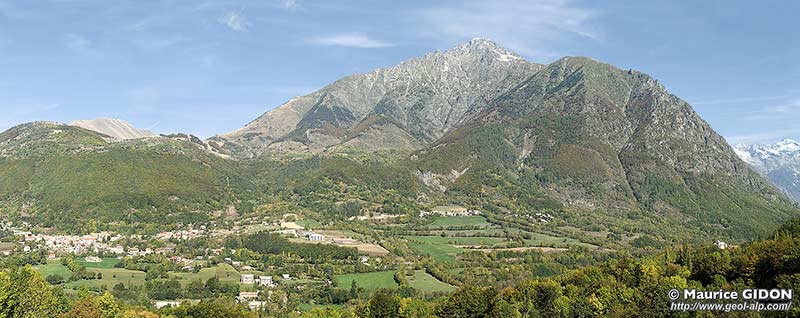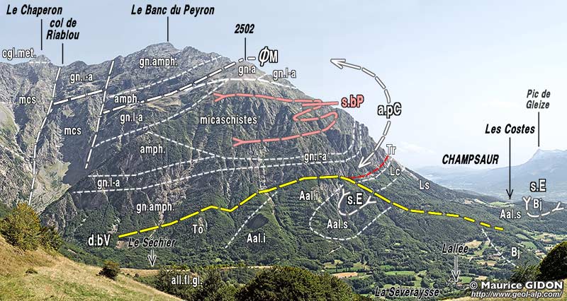 ![]() Le versant nord du Petit Chaillol et la rive gauche du Bas Valgaudemar vus du nord depuis le col de l'Esparcelet. d.bV(en jaune) = décrochement du Bas Valgaudemar ; a.pC = anticlinal N-S du Petit Chaillol, affectant l'interface socle - couverture. ØM = chevauchement de Moussière ; s.bP (en rose) = synclinal E-W du Banc du Peyron (pour plus d'explications sur le socle cristallin voir la page "Petit Chaillol") |