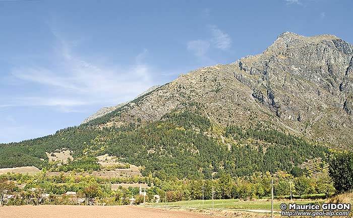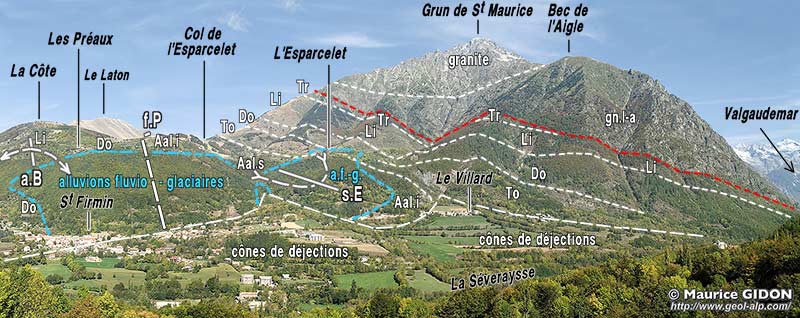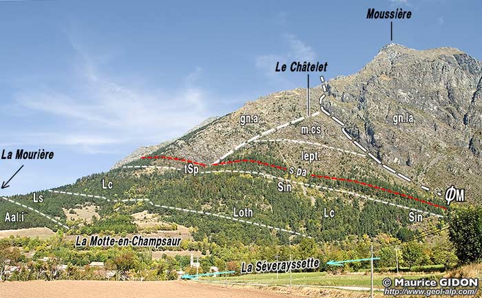 Toutefois cet accident n'est pas un chevauchement, mais une importante faille de coulissement dextre, le décrochement du Bas Valgaudemar, que le cours de la rivière suit presque exactement plus en amont, entre les villages du Séchier et de Saint-Maurice. En fait on retrouve bien l'interface socle - couverture en position renversée, comme sur l'autre rive, dans les pentes dominant Les Costes (voir la page "Chauffayer"), mais elle est reportée de 2 km vers l'ouest par rapport à sa position au nord de la rivière (ce renversement correspond au déversement vers l'ouest de l'anticlinal du Petit Chaillol)