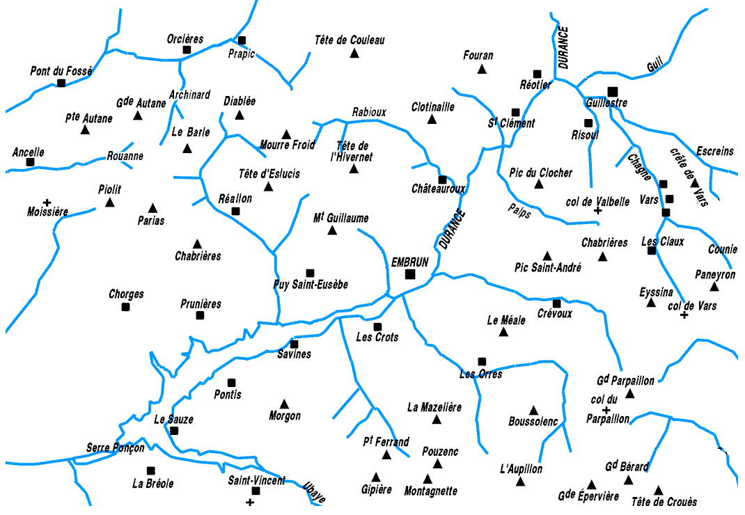 A/ Carte des localités de l'Embrunais de part et d'autre de la Durance :