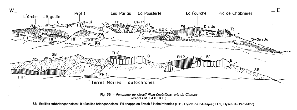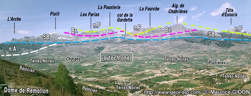 4 - la nappe de flysch à Helminthoïdes du Parpaillon, largement représentée dans tout le pourtour oriental de la demi-fenêtre (à l'est de Savines) ; plus à l'ouest elle a été de plus en plus largement décapée par l'érosion et elle n'y subsiste finalement que sous forme de lambeaux résiduels posés en chapeau sur certains sommets (Autanes, au nord de Chorges ; Tête de la Gypière, au SE du Morgon).