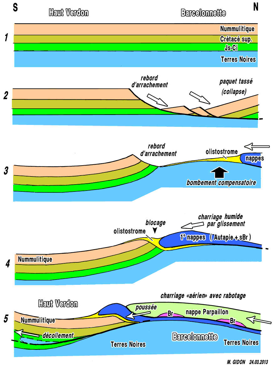 L'idée nouvelle présentée ici (avril 2013) consiste à envisager que l'essentiel de l'ablation des termes récents de l'autochtone s'est produit vers la fin de la sédimentation nummulitique et qu'il résulte d'un phénomène de méga-collapse. La tranche supérieure de la succession stratigraphique se serait détachée à la faveur de failles extensives pour s'évacuer vers le NE, en direction du domaine plus interne (supposé plus profond), actuellement disparu à l'est de l'emplacement de l'actuelle faille de la Durance (abords actuels de Guillestre). Ainsi a dû se former une sorte de cirque limité du côté SW par un rebord d'arrachement constitué par des failles extensives, principalement à regard vers le nord et le nord-ouest. On peut s'attendre à ce qu'elles aient eu un miroir fortement redressé dans les roches "compétentes" supérieures (faisant originellement plus de 50° par rapport à aux couches) mais incurvé, à concavité vers le haut (failles listriques), en devenant plus proche de l'horizontale dans les niveaux plus profonds et plus marneux du Néocomien et/ou du Jurassique tout-à-fait supérieur. En fait il semble qu'un exemple d'une telle géométrie ait été conservé et soit observable entre le Lac d'Allos et la crête des Tours du Lac (C.K., notice de la feuille Allos). Il faut considérer que cet épisode est nettement antérieur à l'arrivée des nappes, car la surface du rebord de la zone dénudée est garnie par la formation olistolitique de la fin de la sédimentation nummulitique, sur laquelle les nappes se sont ensuite avancées. La présence de ce rebord (garni en outre, dans sa partie sud- occidentale, par le bourrelet ainsi constitué) a dû au contraire faire franchement obstacle lors de la mise en place de la nappe du Parpaillon et il a dû être, de ce fait, soumis aux efforts mécaniques exercés par l'avancée de cette nappe. D'autre part la partie basse, la moins compétente et la plus riche en niveaux marneux de la couverture autochtone supérieure aux Terres Noires se trouvait au niveau altitudinaire de la surface de charriage : il était normal qu'il s'y crée une ou plusieurs surfaces de glissement par laminage tectonique. À la faveur de ce dispositif la tranche supérieure, calcaire et gréseuse, de cette couverture a donc pu aisément être décollée et repoussée comme par la lame d'un bulldozer, ce qui s'observe de fait au pourtour SE de la fenêtre de Barcelonnette.