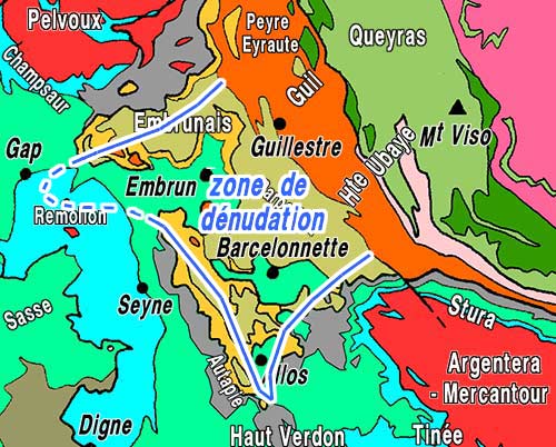 On constate en outre que les limites NW et SE de cette aire rectangulaire se situent assez précisément sous les crêtes de rive droite de la Durance au nord d'Embrun et de rive sud de l'Ubaye au sud de Barcelonnette : en fait elles coïncident étroitement avec les marges NW et SE de la zone où les nappes de l'Embrunais - Ubaye n'ont pas été enlevées par l'érosion (voir à ce sujet les pages "Embrunais" et "Basse Ubaye" et les cartes du secteur). Or il s'agit là de crêtes chapeautées par la nappe du Parpaillon, dont les affleurements masquent très précisément la limite de la zone dénudée au sein de l'autochtone, ce qui empêche d'observer les modalités du passage aux domaines non dénudés de cet autochtone.