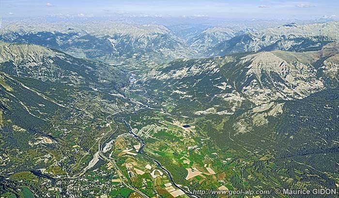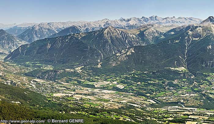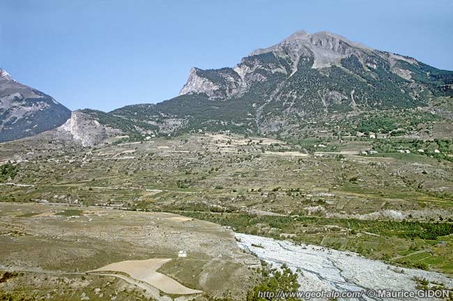 En rive gauche de la Durance le fond de vallée est occupé, aux abords de Siguret, par de larges affleurements de matériel subbriançonnais qui descendent jusqu'au lit de la rivière et y donnent un relief de collines capricieuses. Plus au sud, dans les pentes de Saint-André d'Embrun, ce matériel n'affleure plus qu'au bas des raides versants d'où s'échappent les torrents de Palps et de Crévoux et qui culminent aux sommets de Razis et de Chabrières.