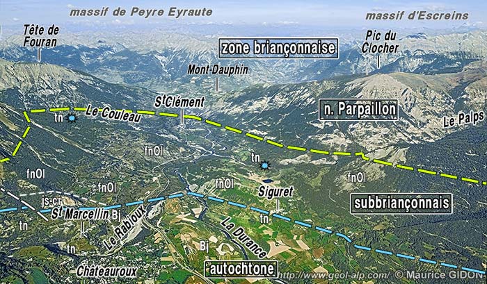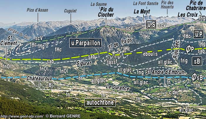 En remontant la vallée de la Durance depuis Châteauroux on voit s'abaisser jusqu'au niveau du fond de la vallée, les surfaces de chevauchement séparant les nappes de charriage qui s'empilent sur les deux versant opposés : leur convergence vers l'amont leur fait dessiner un profond "V topographique" qui traduit le fait que l'on est là à la retombée orientale du vaste anticlinal de nappes* de l'Embrunais. Mais la pente de la surface à la faveur de laquelle l'autochtone disparaît vers l'est en s'enfonçant sous le matériel charrié est peu inclinée de sorte que la nappe inférieure, subbriançonnaise affleure assez longuement, en fait jusqu'à Saint-Clément.