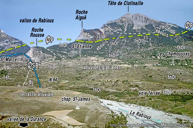 ![]() Les pentes de rive droite de la Durance aux environs de Châteauroux, vues du sud depuis Saint-André d'Embrun (Les Rencuraux). ØSB = surface de chevauchement des nappes de l'Embrunais ; js-ci = Jurassique supérieur- Crétacé inférieur ; fnOl = flysch noir (éocène) olistolitique (formation de Saint-Clément). ØP = surface de chevauchement de la nappe du Parpaillon ; scv = schistes noirs du col de Vars (formation basale du flysch à Helminthoïdes), formant le cœur de l'anticlinal couché du Rabious (voir la page "Vautisse") ; f.Hg = flysch à Helminthoïdes inférieur, gréseux ; f.Hc = flysch à Helminthoïdes calcaire (masse principale). ØpC : surface de chevauchement de l'unité du Pic Crévoux. |