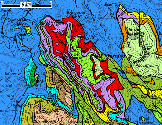 La position de ces couches, au dessus des abrupts liasiques du versant ouest, résulte de ce qu'elles y sont été renversées par le plissement et appartiennent au flanc supérieur du synclinal couché du Morgon. Les affleurements de Jurassique et de Crétacé du coeur de ce synclinal forment une bande qui se poursuit au flanc des escarpements sur le versant ouest de la montagne (voir la page "Morgon ouest").