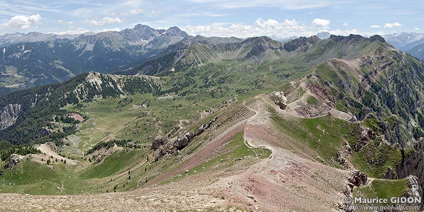 Le cirque du Morgon, vu du NW depuis le sommet du Pic de MorgonLes alpages du creux du cirque sont installés sur les couches triasiques du flanc inverse du synclinal couché du Morgon ; les abrupts du bord droit du cliché sont entaillés, en contrebas, dans les couches plus récentes, liasiques, de ce même flanc de pli. Par contre la crête qui ferme le cirque du côté oriental (Pic Martin Jean, Pic de Charance, l'Aiguille) appartient à une unité tectonique indépendante qui chevauche celle du Morgon et où prédominent les calcschistes du Crétacé supérieur. Elle est ployée en un synclinal à cœur de flysch noir où est même pincé un peu de flysch à helminthoïdes (voir aussi la page "Boscodon"). |