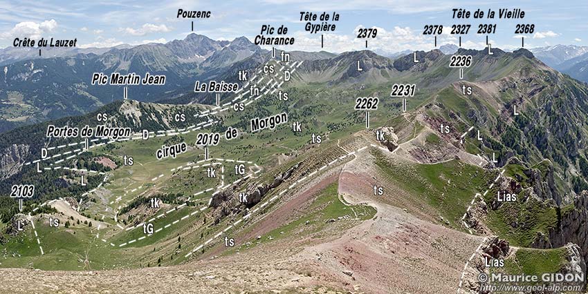 La crête qui ferme le Cirque de Morgon du côté est, depuis le Pic de Martin Jean jusqu'au Pic de Charance (voir aussi la page "Boscodon"), est formée au contraire de couches à l'endroit qui reposent sur les cargneules du fond de cirque : elles semblent représenter simplement le flanc normal de l'anticlinal couché faisant suite vers le haut au synclinal du Morgon (et dont les cargneules du fond de cirque jalonnent le coeur). Toutefois la succession sédimentaire, bien que de caractère également subbriançonnais, y différe de celle du Morgon par la réduction d'épaisseur de ses termes jurassiques et la beaucoup plus grande épaisseur des calcschistes néo-crétacés.