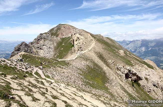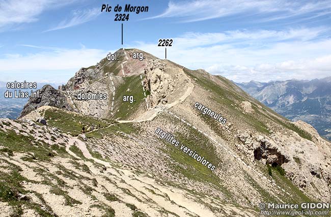 - une volée d'abrupts qui tombent en falaises à l'aplomb du sommet (on y distingue d'ailleurs que leurs couches dessinent une charnière couchée ouverte vers le sud. À l'est du sommet ces abrupts, sont boisés mais se poursuivent en constituant un entablement qui soutient une dépression de hauts alpages suspendus, nommée le Cirque du Morgon. Cet ensemble appartient aux nappes de l'Embrunais - Ubaye.