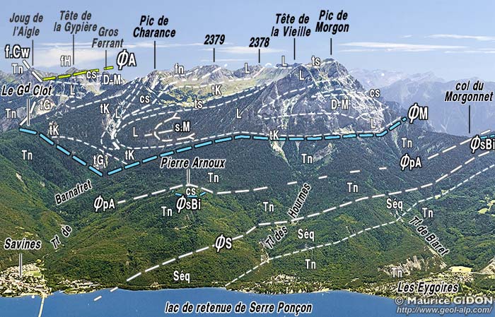![]() La montagne du Morgon, vue du nord-ouest, depuis la Croix du Vallon (Montagne de Chabrières). f.Cw = faille occidentale des Courréous (voir la page Montagnette) ; ØA = chevauchement de la nappe de l'Autapie ; ØM = surface de chevauchement de l'unité subbriançonnaise du Morgon ; ØsBi = surface de chevauchement de la nappe subbriançonnaise basale ; ØpA = surface de chevauchement de l'"écaille parautochtone" de Pierre Arnoux ; ØS = surface de chevauchement de l'"écaille parautochtone" de Savines ; s.M = synclinal du Morgon. |