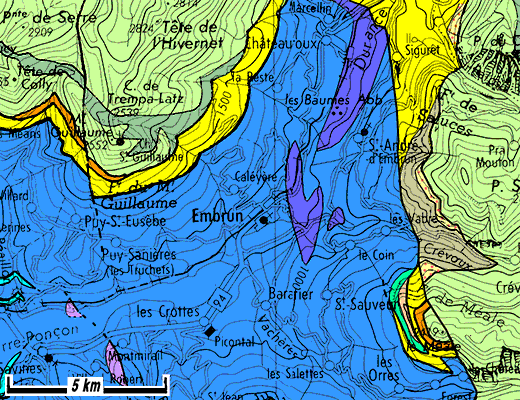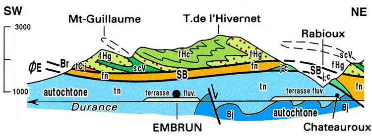 ![]() coupe de la rive droite de la Durance aux environs d'Embrun (extrait retouché de la carte Embrun 2° éd.) de bas en haut : ØE = surface de chevauchement des nappes de l'Embrunais ; fn = flysch noir des unités subbriançonnaises (en vert émeraude : écaille de Jurassique supérieur- Crétacé inférieur de Roche Rousse) : flysch éocéne olistolitique (formation de Saint-Clément) et Br = écaille de matériel briançonnais. s.cV = schistes noirs et pourpres du col de Vars (formation basale du flysch à Helminthoïdes) ; f.Hg = flysch à Helminthoïdes inférieur, gréseux ; f.Hc = flysch à Helminthoïdes calcaire (masse principale). |
