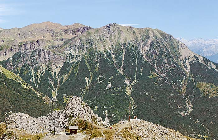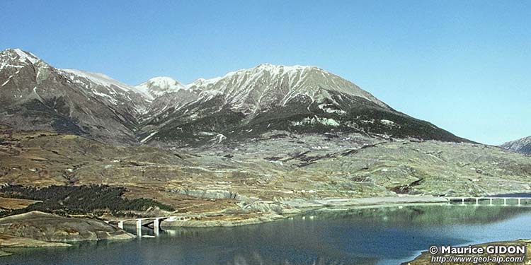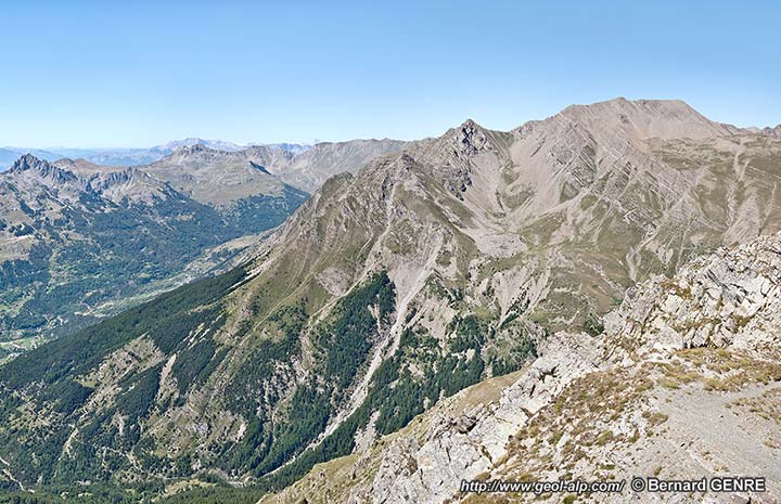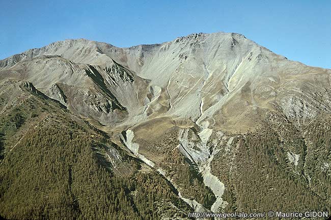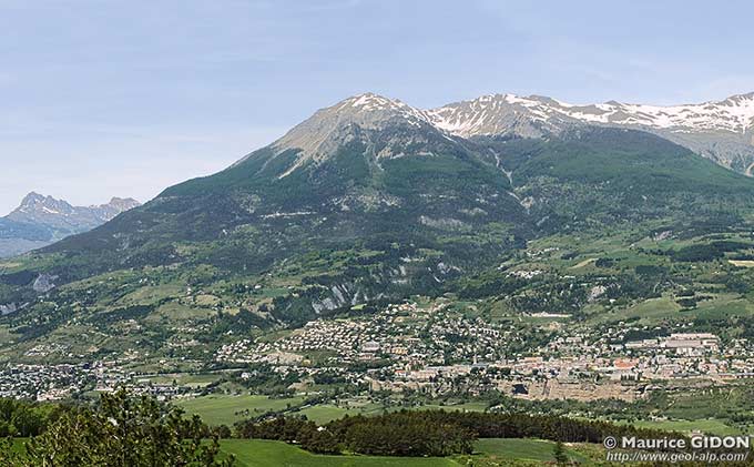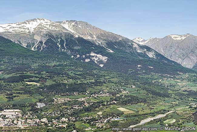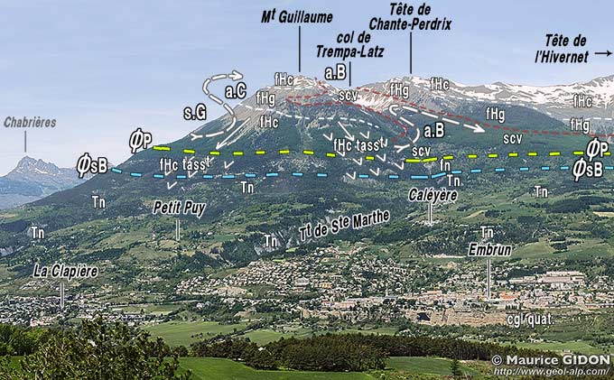 2 - La structure en plis couchés du flysch à Helminthoïdes du Mont Guillaume est bien visible sur la coupe naturelle, orthogonale à ces plis, que donne le versant sud-oriental de la montagne qui tombe sur Embrun et la vallée de la Durance (voir aussi la coupe ci-après).