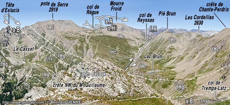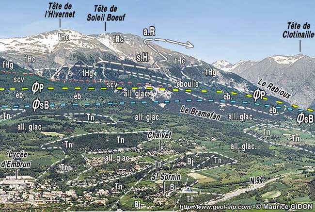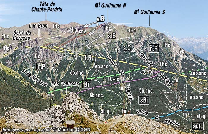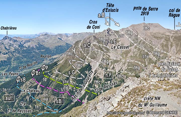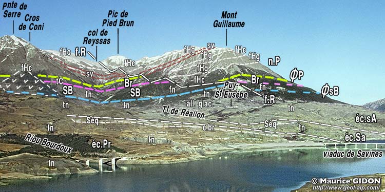 ![]() Le versant occidental du Mont Guillaume, vu du sud-ouest, depuis les abords de Pontis. ØsB = surface de chevauchement basale des nappes de l'Embrunais (unités subbriançonnaises) ; ØP = surface de chevauchement de la nappe du Parpaillon ; f.R = faille de Reyssas (plus de détails en fin de page), qui traverse le versant en biais à flanc de pente, en sectionnant ses ravins. Au sein des Terres Noires d'avant-plan on trouve quelques témoins des niveaux supérieurs (Argovien et Séquanien), ainsi que des conglomérats d'âge crétacé supérieur (c.br), qui s'intercalent en lames pentées vers l'E-NE : ils témoignent d'une imbrication* d'écailles parautochtones*, dispositif qui augmente d'ailleurs l'épaisseur apparente des Terres Noires. Ces écailles de Prunières-Pontis (éc.Pr), de Savines (éc.Sa) et de Saint-Apollinaire (éc.sA) se sont avancées vers l'ouest, en recouvrement sur l'autochtone sensu stricto, sans doute par un effet d'entraînement induit par la charriage des nappes d'origine interne. |