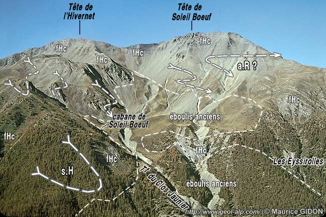 ![]() La Tête de l'Hivernet et le vallon de Soleil Bœuf, vue plus rapprochée, de l'est, d'avion. On distingue plusieurs charnières secondaires qui ont une polarité typique d'un flanc inverse (dans l'hypothèse de plis déversés de la droite [NE] vers la gauche [SW]) (voir le schéma général et comparer, à titre d'exemple, à la photo du Barle). s.H = synclinal de l'Hivernet (la charnière représentée est symbolique car elle n'est pas visible) ; a.R? = anticlinal du Rabious (la charnière visible ici n'est peut-être pas la principale du pli et correspond peut-être encore à un repli de flanc inverse). |