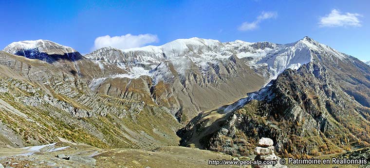Cette limite entre les nappes de l'Embrunais et leur autochtone se situe aux environs de 1500 m d'altitude. La rupture de pente correspondant à cette altitude est d'ailleurs accentuée par le fait que c'est aussi à ce niveau que culminent les alluvions glaciaires wurmiennes qui garnissent le bas versant (voir à ce sujet les pages "Embrun" et "Les Orres").