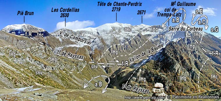 Le torrent du Reyssas entaille le versant septentrional de la vallée de Réallon à l'ouest du Mont Saint-Guillaume. Il y dessine un important rentrant vers le nord qui donne une coupe des unités empilées, à partir des Terres Noires autochtones jusqu'à la nappe du Parpaillon.