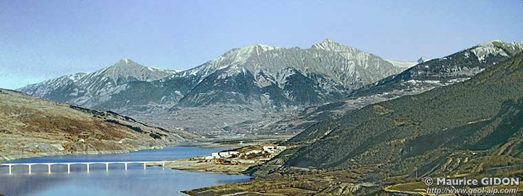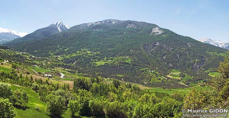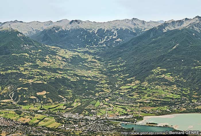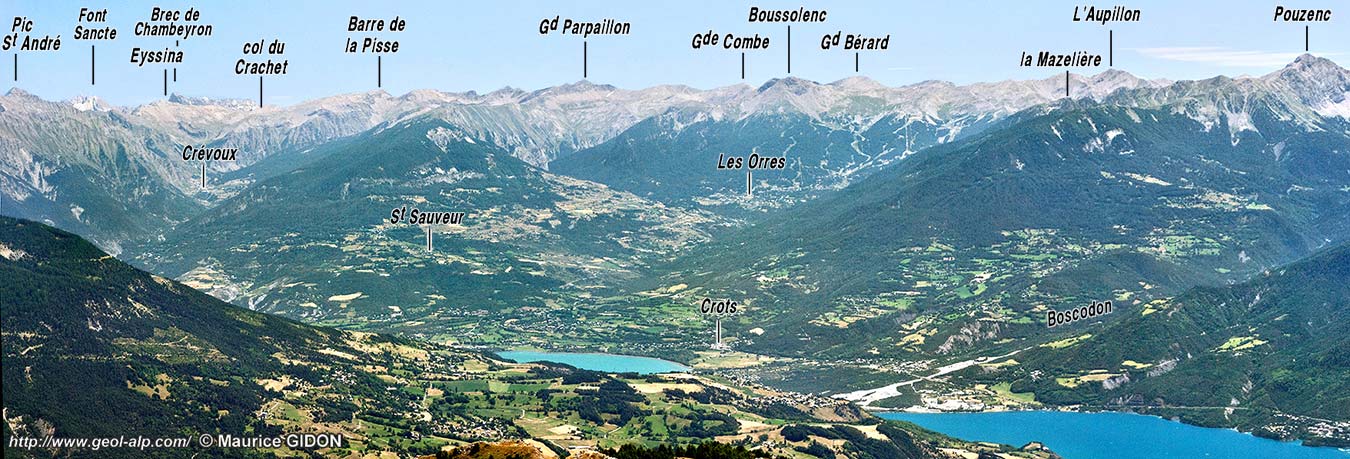 ![]() Panorama de la rive gauche de la Durance entre Embrun et Savines, vu de l'ouest depuis la Croix du Vallon, sous les Aiguilles de Chabrières (charger version plus grande). |