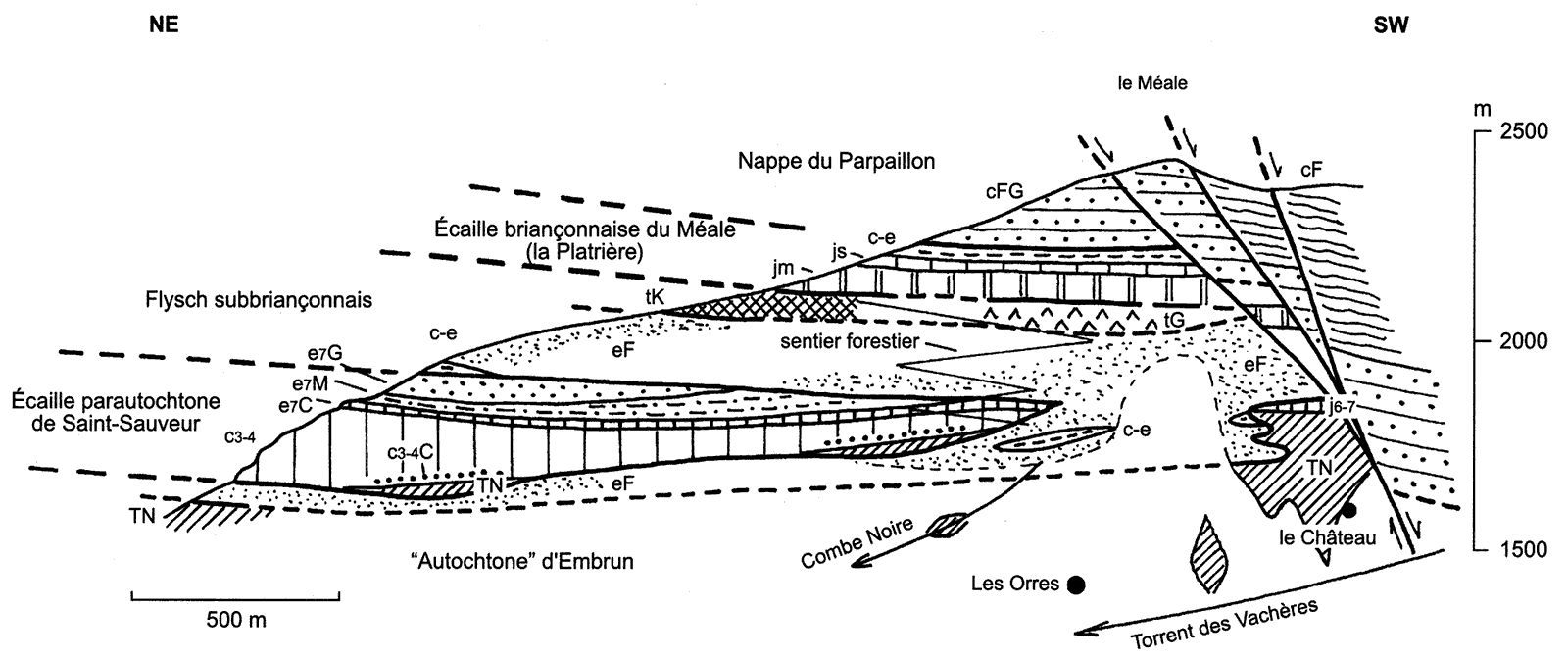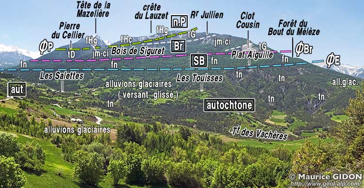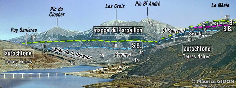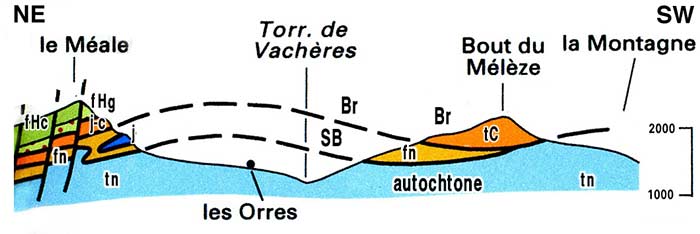 ![]() coupe schématique SW-NE, transversale à la vallée des Orres (extrait retouché de la carte Embrun 2° éd.) Br = écailles de matériel briançonnais ; SB = écailles de matériel subbriançonnais ; tC = Trias calcaréo-dolomitique briançonnais ; fn = flysch noir subbriançonnais; j = jurassique moyen ("écaille de Saint-Sauveur") ; f.Hg = flysch à Helminthoïdes inférieur, gréseux ; f.Hc = flysch à Helminthoïdes calcaire (masse principale) |