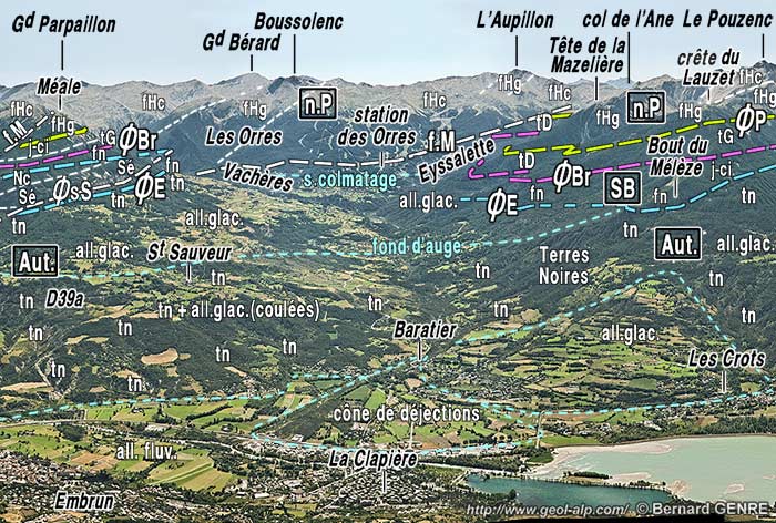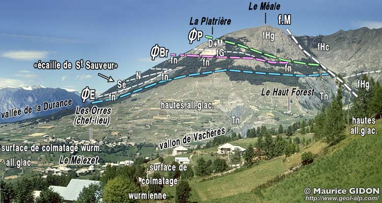 ![]() Les Orres et le Méale, vus du sud, depuis le village de Pramouton (avant la construction de la station de ski) Un garnissage d'alluvions glaciaires relativement anciennes tapisse les hautes pentes au dessus des villages et de la principale surface de remplissage de la vallée anté-wurmienne. Les ravines l'entaillent en rive droite du vallon de Vachères et en montrent le substratum de Terres Noires autochtones. ØE = surface de charriage des nappes de l'Embrunais, qui est ici celle du flysch noir de la zone subbriançonnaise ; dans ce dernier s'intercale l'écaille de Saint-Sauveur, dite "parautochtone" car constituée de Sénonien et de Nummulitique, qui a donc été arrachée à la couverture des Terres Noires autochtones. ØBr = surface de charriage de la lame de matériel, d'origine briançonnaise, de La Platrière ; ØP = surface de charriage de la nappe de flysch à Helminthoïdes du Parpaillon ; f.M = faille N-S, tardive (post-nappes) extensive et coulissante (?) du Méale. |