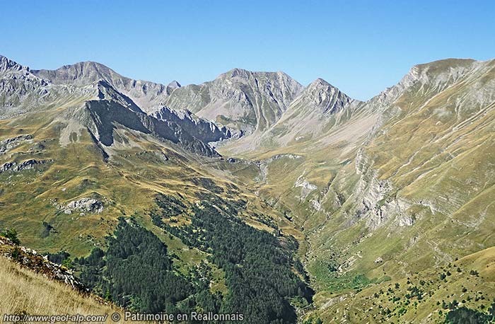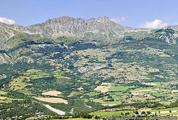 On voit plus difficilement, au pied de ces abrupts, l'organisation des lames tectoniques des unités inférieures, subbriançonnaises, qui prolongent vers l'est celles du chaînon du Piolit dans le haut du versant moins déclive qui descend vers Chorges. En effet leur matériel constitutif s'est ici largement disloqué en paquets tassés* qui ont glissé sur leur soubassement autochtone, constitué par les Terres Noires du flanc nord-oriental du Dôme de Remollon. Certains de ces paquets rocheux, mêlés à des éboulis anciens, sont d'ailleurs descendus presque jusqu'au pied des pentes qui dominent Chorges.