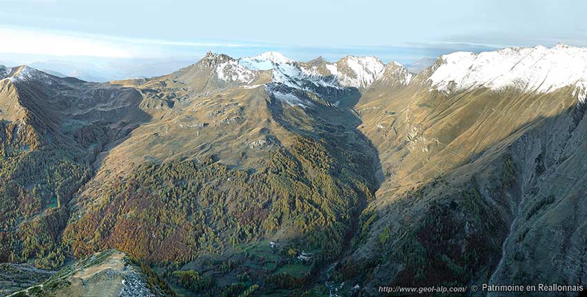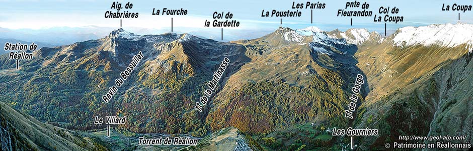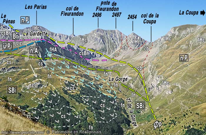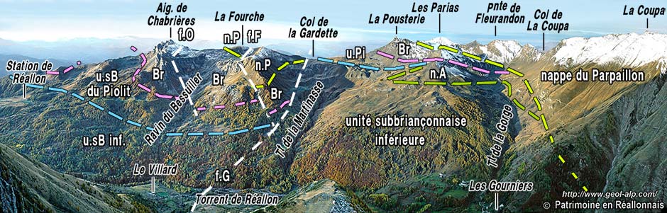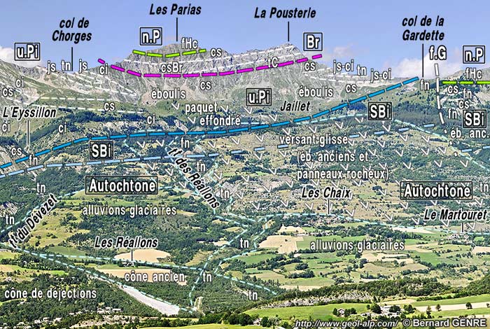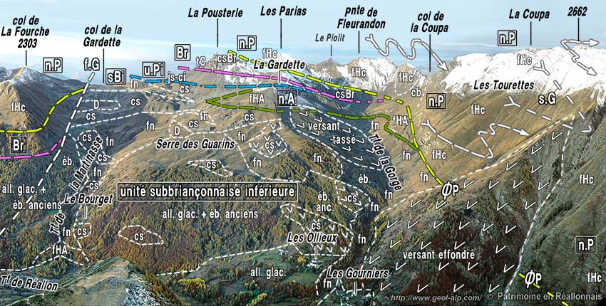 ![]() La rive droite de la vallée de Réallon à la latitude des Gourniers, vue du NE depuis le sommet du Piarra (extrémité occidentale du chaînon d'Eslucis) (clichés originaux obligeamment communiqués par M. Alain Gleize). n.P = nappe de flysch à Helminthoïdes du Parpaillon (cb = schistes noirs du col de Vars) : les charnières représentées sont celles des replis des deux flancs d'un pli majeur, le synclinal des Gourniers (s.G ) ; Br. = unité briançonnaise de la Pousterle ; u.Pi = unité subbriançonnaise de Piolit ; n.A = nappe de l'Autapie : son matériel (flysch à Helminthoïdes noté fHA) s'intrique avec celui de l'unité suivante à plusieurs niveaux, notamment en fond de vallée sous le Bourget et aux Gourniers) ; sBi = unité subbriançonnaise inférieure (flysch noir prédominant et lames de calcschistes néocrétacés). f.G : faille de la Gardette (compartiment gauche abaissé). la suite du paysage vers la gauche est représenté à la page "Chabrières" et vers la droite à la page "Réallon". |