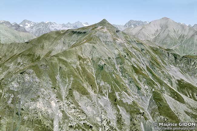 La pyramide sommitale de la montagne du Piolit vue d'avion, du sud, depuis l'aplomb des pentes au nord de Chorges.