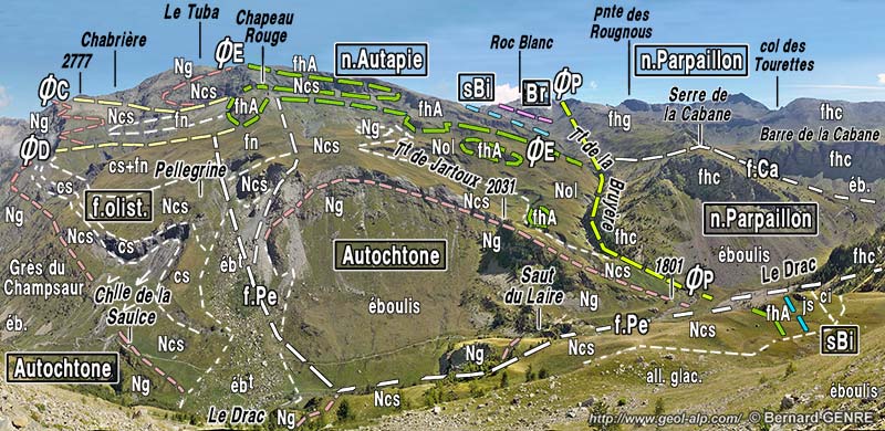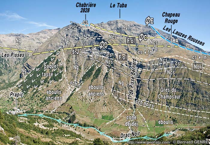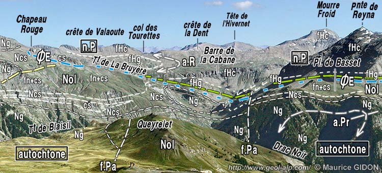 ![]() La rive droite du Drac Noir (partie amont), vue du sud, depuis les pentes de Basset (cliché original obligeamment communiqué par M. Bernard Genre). ØD (en jaune) = chevauchement du Diolion ; ØC = chevauchement de Chabrière ; ØE = surface de chevauchement des nappes de l'Embrunais. Ici la plus basse est une forte lame de flysch à Helminthoïdes de la nappe de l'Autapie. Ce chevauchement recoupe en discordance les structures du Nummulitique chevauché et son tracé dessine de nombreux contours car sa surface plonge vers le lit du Drac de façon à peu près tangente à la surface topographique ; ØP = faille de la Bruyère (limite occidentale des affleurements de la nappe du Parpaillon). f.Pe = faille de Pellegrine (compartiment de gauche abaissé) (voir la page"Mourre Froid") ; f.Ca = faille de la Cabane. f.olist. = formation olistolitique de la fin de la sédimentation nummulitique ; elle comporte ici deux niveaux : Nol = olistostrome proprement dit (flysch noir emballant des lentilles de calcschistes néocrétacés) ; Ncs = niveau de calcschistes à Nummulites représentant sans doute une écaille tectonique. |