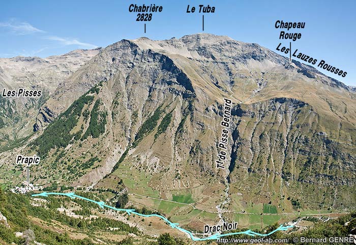 En fait c'est cette vallée du Blaisil qui reçoit latéralement, au village de Prapic le cours tout-à-fait supérieur du Drac Noir, qui lui est orthogonal puisqu'il descend du sud-est : La toponymie y est donc assez paradoxale puisque ce dernier qui apparaît plutôt comme un affluent qui s'embranche latéralement. Sans doute ce choix de dénomination est-il justifié par le plus fort débit que lui confère l'apport des eaux recueillies dans la relativement large dépression qu'il draine, entre le versant septentrional du Mourre Froid au SW et le col des Terres Blanches au NE (voir la page "Terres Blanches")... |