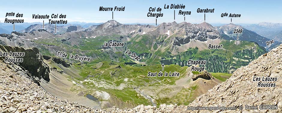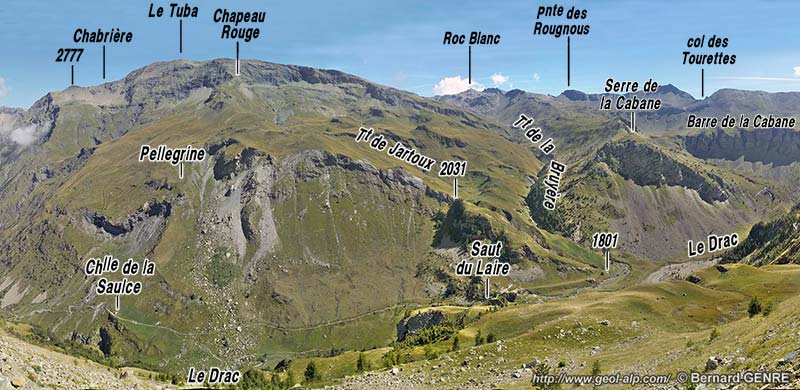La partie méridionale de la dépression de source du Drac est fermée par la crête qui court du SE vers le NW depuis le Mourre Froid jusqu'au Garabrut (voir à son sujet la page "Mourre Froid"). La crête elle-même est également constituée exclusivement par le flysch à Helminthoïdes calcaire de la nappe du Parpaillon.