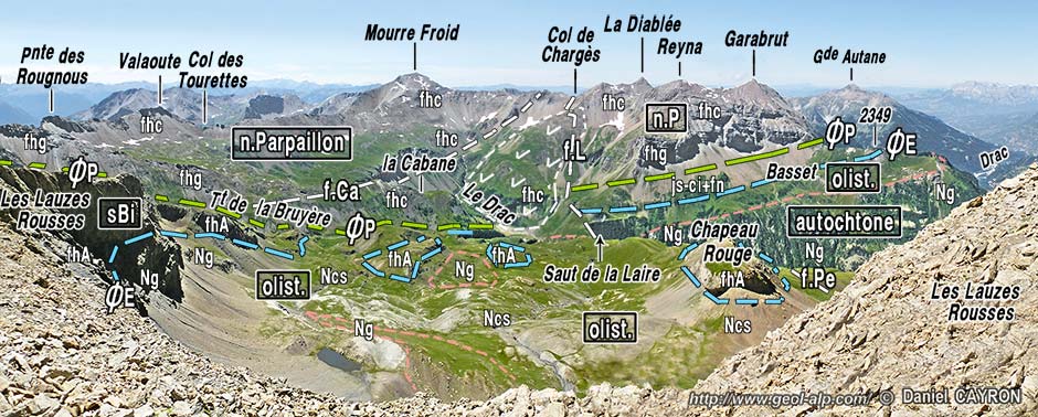 ![]() La dépression des sources du Drac Noir, vue du nord depuis la crête des Lauzes Rousses (cliché original obligeamment communiqué par Mr. D. Cayron). ØP = surface de chevauchement de la nappe du Parpaillon ; ØE = surface basale des nappes de l'Embrunais (sBi = unité subbriançonnaise inférieure) ; f.L = prolongement probable de la faille du Laus (voir la page "Mourre Froid"), se prolongeant peut-être, elle-même, par la faille de Pellegrine, en rive droite du Drac ; f.Ca = faille de La Cabane (prolongement éventuel d'une branche orientale de la faille du Laus). |